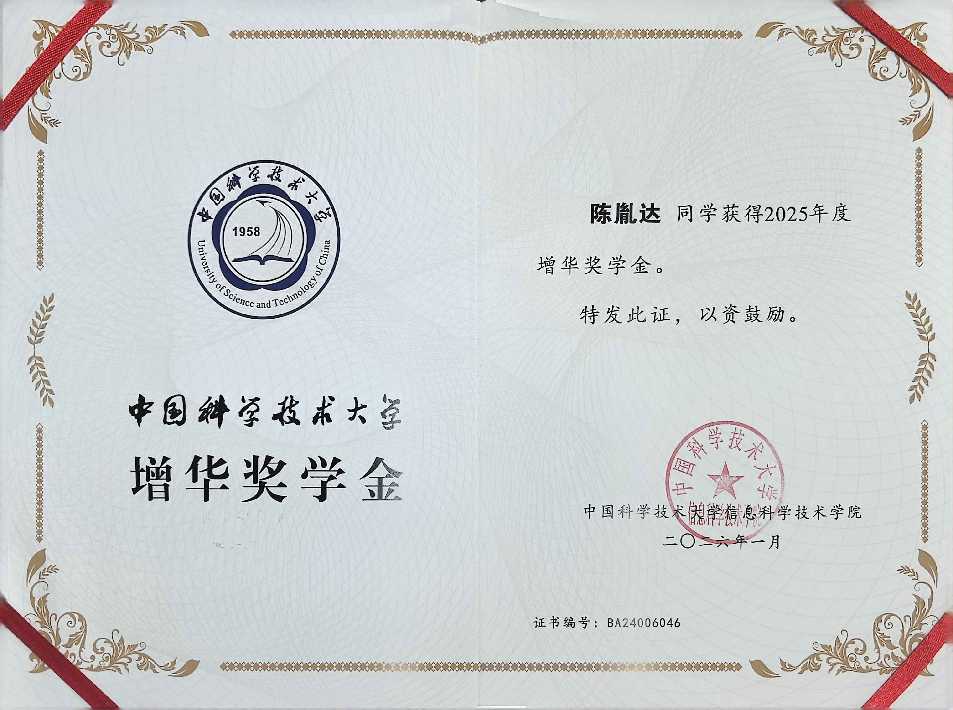 - Level: University-level scholarship, USTC