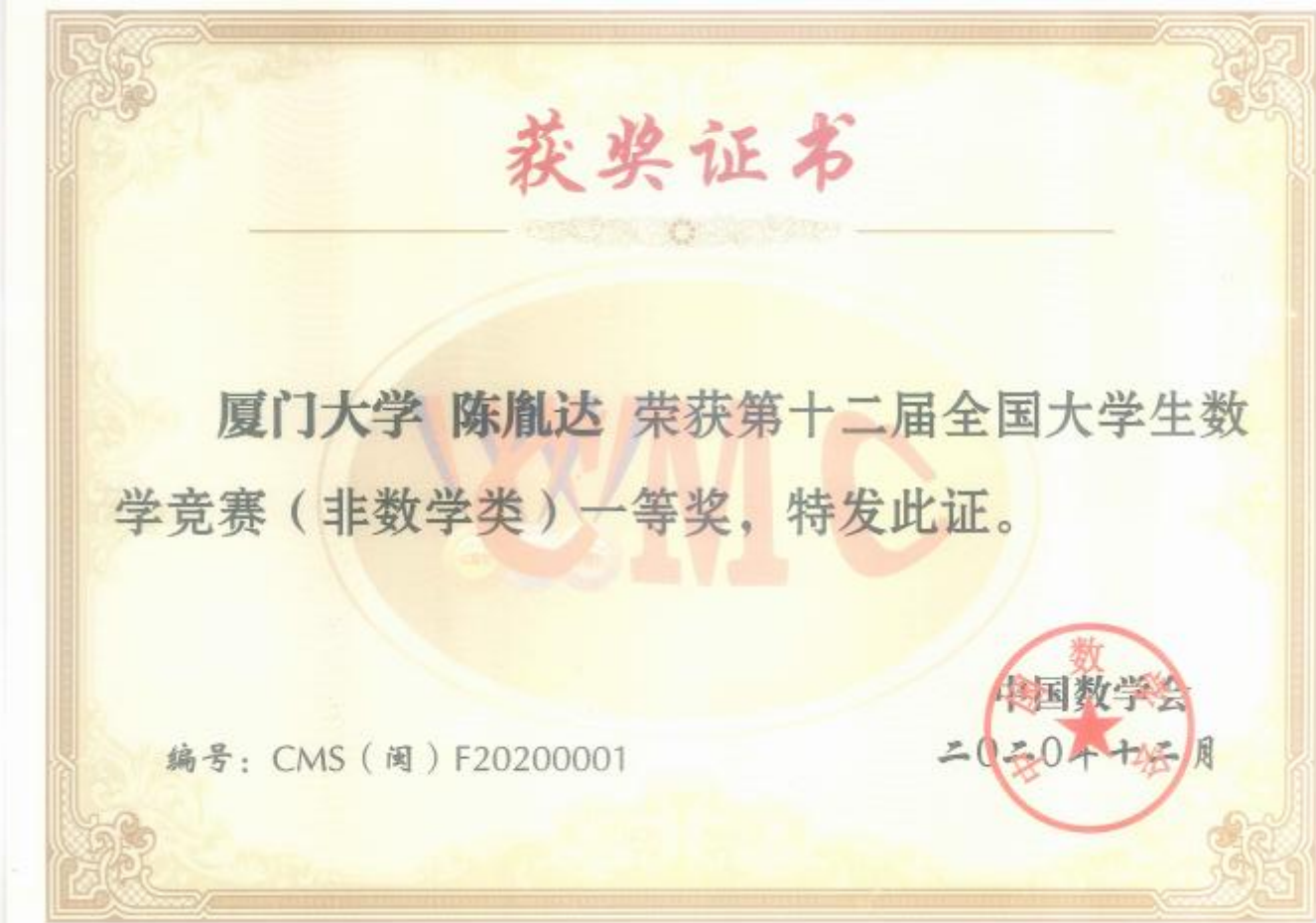 - 🏆 National Undergraduate Mathematics Competition (Non-Major Category), First Prize (November 2020)