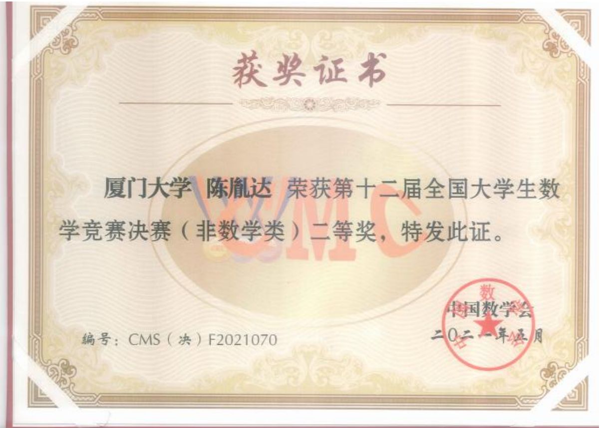 - 🏆 National Undergraduate Mathematics Competition (Non-Major Category), Second Prize (May 2021)